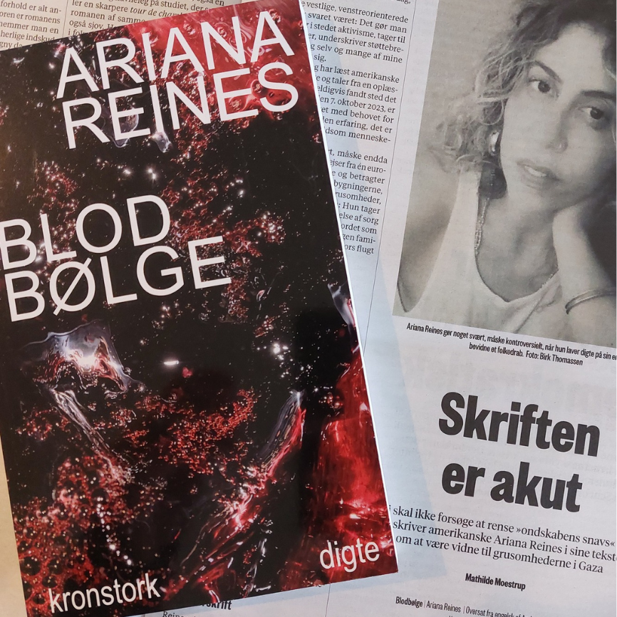 I Information har Mathilde Moestrup fuld af beundring anmeldt Ariana Reines Blodbølge. Hun skriver blandt andet: "Den blodbølge, der skyller ind over verden og læseren i værket, er altså ikke bare udryddelsens blod, de mange børnelig, der gang på gang dukker op på telefonskærme i teksterne, men også det blod, der løber fra digterjegets kvindekrop. Både menstruationen og livmoderen bliver i Reines’ værk en måde at tilgå skriften." (...) "Ariana Reines’ tekster er gennemstrømmet af en dyb tro på sprogets potentiale – til at ødelægge og formumme os, men også til at skære sig vej igennem det ideologiske og intellektualiserende."