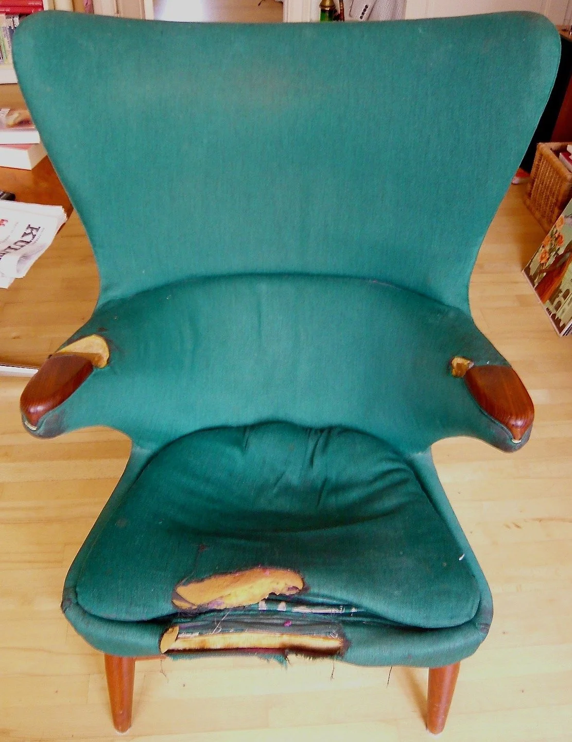 I denne lænestol sad jeg omkring tyve år og læste bøger. Når ikke lige jeg skulle noget andet. Jeg købte den i en genbrugsbutik på Amager for 30 kr. i slutningen af 80’erne. Der var den endnu i forholdsvis god stand, ikke så slidt som på billedet. I dag er den endnu mere slidt og står oppe på et loft på Vesterbro. Og fuck, hvor jeg savner den. Nu har jeg brugt halvanden måned på at komme næsten halvvejs gennem Tyngdens regnbue (Gravity’s Rainbow, 1975) af Thomas Pynchon. Bogen er på 950 store tættrykte sider. Lidt af en udfordring. Og jeg vil skynde mig at sige, at det ikke har noget med oversættelsen at gøre. Den virker gedigen nok. Og sikke et arbejde Claus Bech har været igennem. Respekt! Det er fandme stamina. Nej, det har noget med Pynchon at gøre. Det er et komplet labyrintisk værk med mange stier, som forgrener sig, og mange tangenter, som forlænger sig lysår ud i universet. Men i grove træk: Romanens første del foregår i London i 44/45, hvor tyskernes V1- og V2-raketter ramler ned med ujævne mellemrum. Vi følger en særlig eksperimental militær organisation, som bl.a. beskæftiger sig med det okkulte og har et medie ansat, som kan tale med ånderne (Pynchon er ikke så lidt af en satiriker). Sideløbende foregår der andre eksperimenter med afsæt i Pavlovs teorier, ikke mindst idéerne om stimulus/respons (her bliver Pynchon lidt spydig). Og så sidder der en statistiker og markerer alle nedslag af V1- og V2-raketter på et kort over London for at se om der er et mønster … Og nu bliver det lidt karlekammeragtigt, for under store krige foregår der ofte en del kønslig aktivitet, som også kan aflæses statistisk på fødselstallene. Og inde ved siden af statistikeren sidder en yngre amerikaner ved navn Slothrop, som er den erotisk mest succesfulde, og markerer på et kort de steder, hvor han har haft sex. Statistikeren opdager, at der er et geografisk sammenfald mellem raketnedslagene og Slothrops eskapader! Hver gang Slothrop har været i aktion et sted, slår en raket ned i nærheden kort tid efter. Højst usædvanligt. Men meget freudiansk, idet raketten naturligvis er det vildeste fallossymbol af dem alle (og Pynchon kan sin Freud, vi er ligesom i 1975). Historien fortsætter ind i anden del, for umiddelbart efter krigens slutning, stikker Slothrop af og rejser ind i Tyskland for at undersøge et spor: En ældre slægtning af ham har været med til at drive raketvidenskaben frem. En slags personlig erkendelsesrejse. Det er omtrent der, jeg er kommet til … og hvorfra jeg kan se frem til at tilbringe en del mere tid sammen med Pynchon. Tænk hvis jeg havde min fantastiske lænestol, det ville være så meget bedre. Det er mere bekvemt at læse i en lænestol end en sofa, hvor du kun kan hvile en arm ad gangen på armlænet. Bedre end at ligge på sengen og skulle holde bogen op. Bedre end at sidde på en stol ved et bord og læne sig frem over bogen og ende med en stiv nakke … Og der er et andet interessant aspekt ved stolen: Engang i sidste halvdel af nullerne holdt vi fødselsdag for min søn. Hele klassen var med, og da det lakkede mod enden, kom forældrene og hentede. En af dem bemærkede den efterhånden noget ramponerede lænestol. Han var møbelsnedker. Og den lænestol jeg havde købt for 30 kr. hos Frelsens Hær, viste sig – iflg. møbelsnedkeren – at være en amerikansk lænestol fra 50’erne, som havde været inspirationskilde for Arne Jacobsen, da han lavede ’ægget’, hans berømte lænestol. Selv i meget ramponeret tilstand ville den nok kunne indbringe 1000-2000 kr. på en auktion. Sagde møbelsnedkeren. Okay! Lidt vildt. Men heller ikke mere vildt end at den blev stående i stuen nogle år endnu, inden den havnede på loftet … Men nu det ord, ’ægget’, bringer mig tilbage til Freud (og Pynchon). For hvad nu hvis min begejstring for stolen skyldtes den æggelignende form? Eller måske ligefrem dens omsluttende livmoderagtige form. Den gjorde det roligt og trygt at sidde i stolen, så jeg bedre kunne koncentrere mig om at læse? Jeg bryder mig ikke rigtig om tanken. Men derfor kan den godt være rigtig alligevel. Mysterierne breder sig i ringe fra Pynchon … Kære læser, skulle du evt. være møbelsnedker og har du et godt tilbud til mig med henblik på køb eller istandsættelse, så er du meget velkommen til at henvende dig til mig (enogtyve, femogfirs, toogfyrre, elleve) … Ja, Pynchon gør mig også paranoid, hvorfor jeg ikke vil skrive mit nummer med tal … Så det ikke bliver høstet af telefonsvindlerne. Som sikkert har en eller anden forbindelse til massakren på herero-folket i det tidligere Tysk Sydvestafrika (i dag Namibia)… Et emne der går igen i Pynchons forfatterskab. Det fylder en del i hans første bog, V, og herero-folket dukker også op i Tyngdens regnbue, nu forbundet med raketvidenskab! Hævnens time? Vi får at se.
